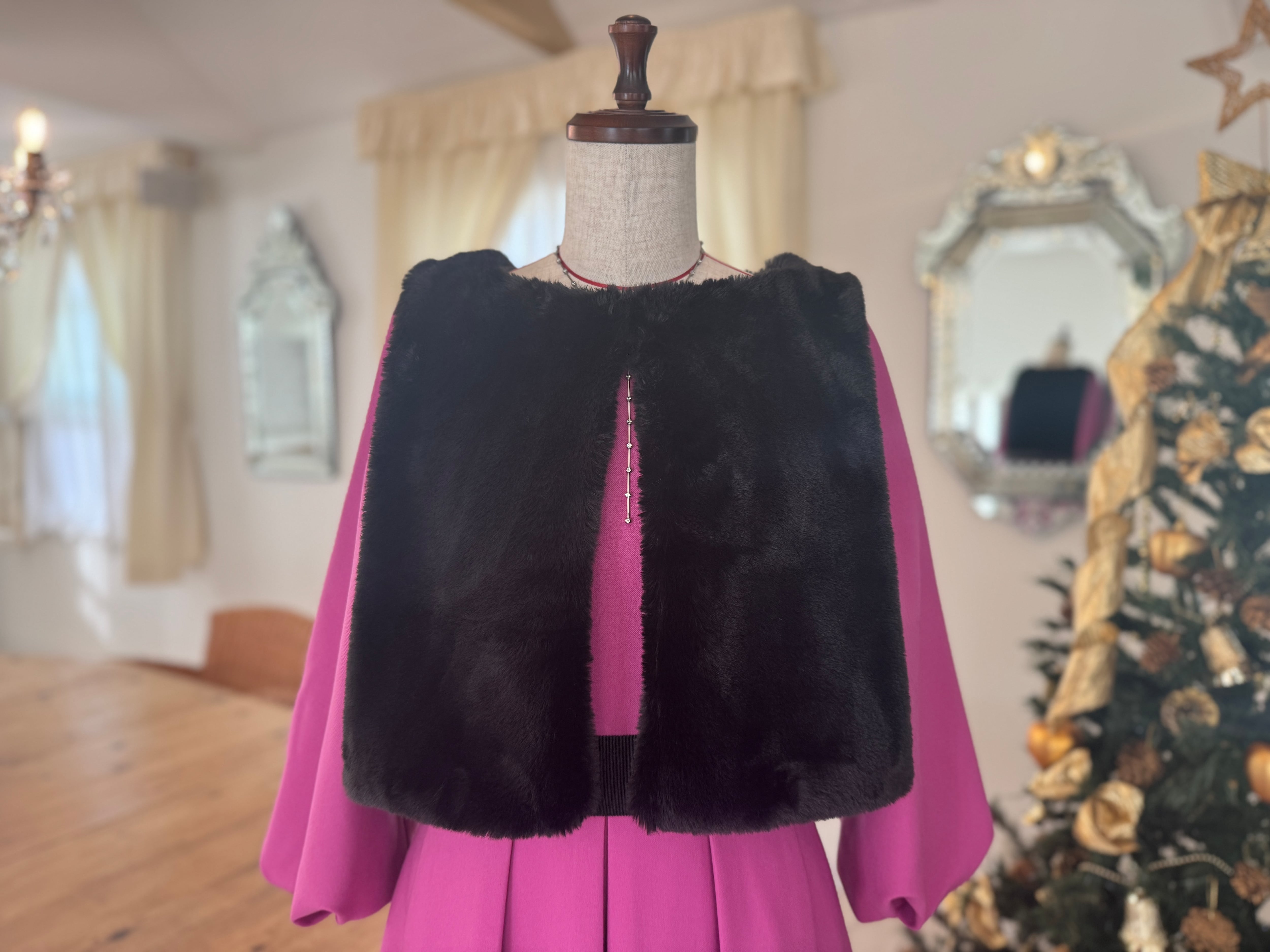 黒のファーがマゼンダの色合いを引き立て、